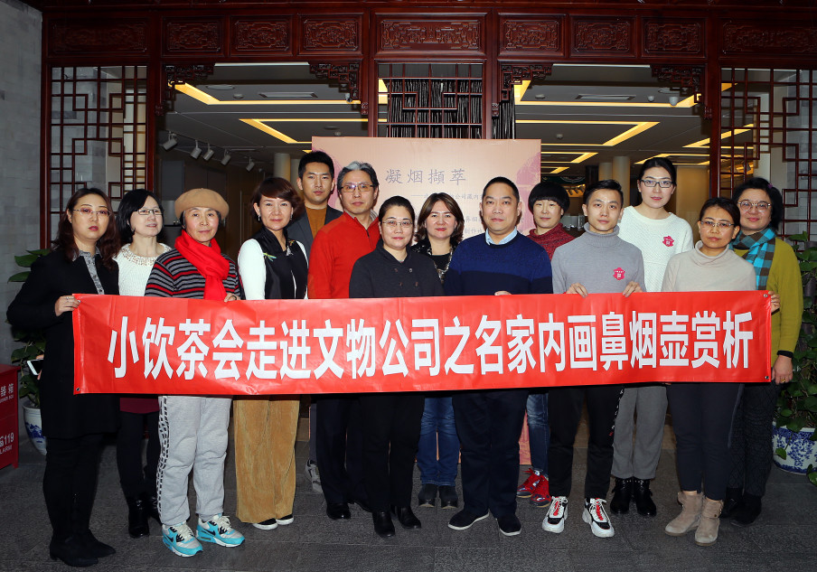 壶里看乾坤,方寸有意境。近日,由北京市文物公司策划的“凝烟撷萃——北京市文物公司藏内画鼻烟壶”展览在琉璃厂虹光阁开幕。展览展出了包括“京派内画四大家”在内的百余件清末民国时期的内画鼻烟壶名家大师作品。1月11日,老舍茶馆小饮茶会带领茶友们走进北京市文物公司虹光阁探知名家内画鼻烟壶的魅力。北京市文物公司党委书记刘燕萍,北京老舍茶馆有限公司常务副总经理唐波,北京市文物公司萃珍斋经营部经理、文物鉴定专家刘国跃与十余位茶友参加。