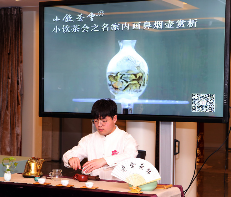 本期茶会的花道作品名为《花看乾坤》,由小饮茶会团队精心创作:以花毛茛、玉兰花、康乃馨、菊花为花材,打造独具韵味的中式慢生活作品。茶友们一边品老舍茶馆己亥猪年生肖饼——金猪祥瑞臻品私藏茶(生普),一边听刘国跃老师娓娓道来,讲述内画鼻烟壶的艺术魅力。